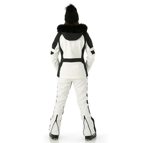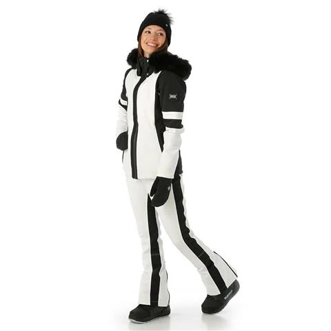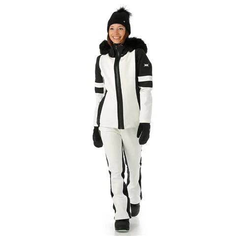 Sporty 4 way stretch ski jacket with stripe detail on sleeve. Black hardware and YKK waterproof zippers. Waterproof/ Breathable rating 20/10.