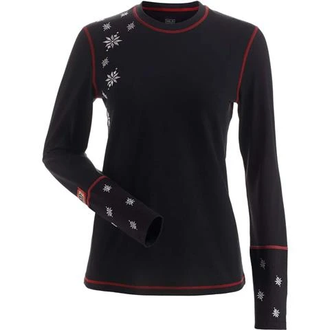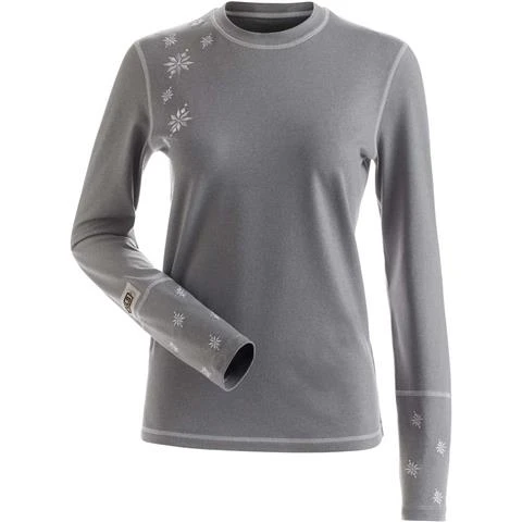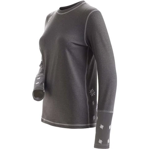 Midweight heathered crewneck with snowflake embroidery, natural wicking properties and contrast coverstitch.