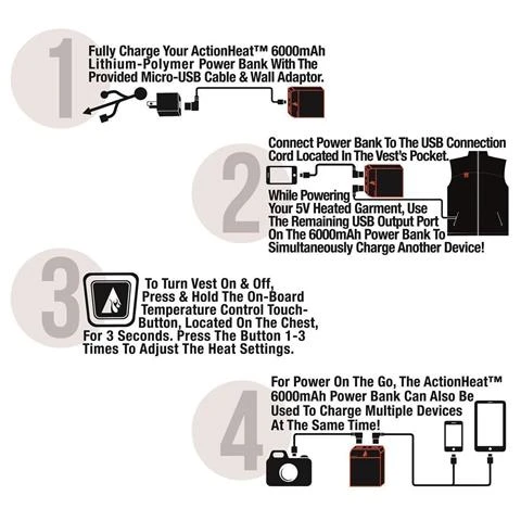 The ActionHeat™ battery heated vests are revolutionary in the world of heated clothing. Using the patented 5V signal technology, it allows for any 5V battery to be used with the ActionHeat Jackets and Vests. This allows for unlimited battery options and gives you more options! The ActionHeat Jacket comes with a super powerful ActionHeat™ 5V Power Bank 6000mAh. This powerbank powers your jacket and can also charge your phone, tablet, or any USB charged device. Note: Heating times will deminish if used to charge other devices.